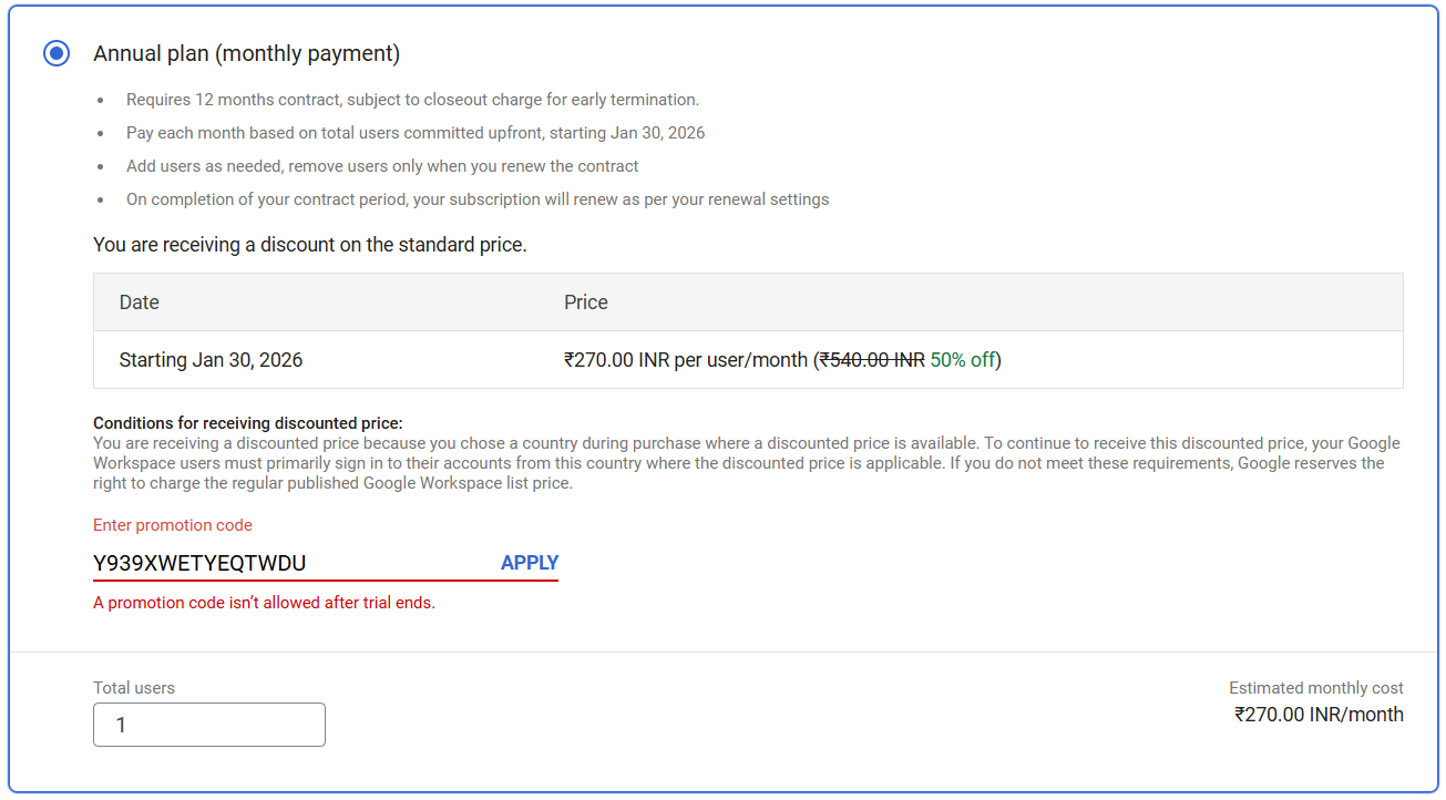 If you see the message "Promotion applied 10% off each month for 12 month(s)", congratulations! Your promo code has been successfully applied. You'll save 10% on your Google Workspace subscription for the entire first year.